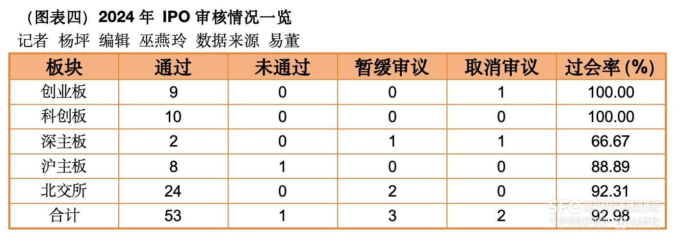 整体来看,2024年IPO节奏有所放缓。从审核端来看,今年上市委会议共进行了57家次企业的审核,其中顺利过会的53家,较去年同期降低81.00%,过会率92.98%,较去年提升4.13个百分点。