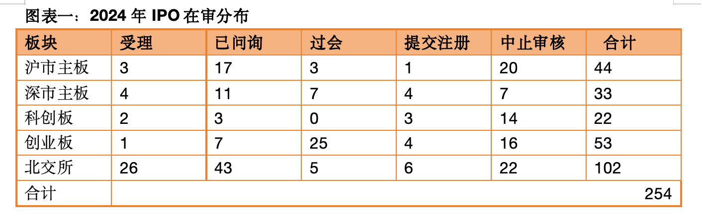 截至12月30日,A股市场IPO在审企业合计254家(含提交注册企业),其中北交所数量最多,为102家,创业板次之,为53家,科创板22家、沪市主板和深市主板分别为44家和33家。