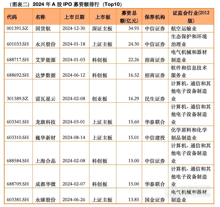 从数据来看,首发募资额超过十亿元的企业有17个,主要集中在10-35亿元区间。其中,2024年最大的一单IPO是国货航,首发募资合计34.95亿元,保荐机构为中信证券,国货航是国内主要的航空物流服务提供商之一,上市板块为深市主板。