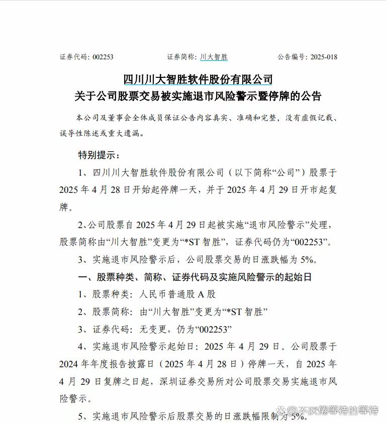 4月27日晚间在线配资开户,川大智胜(002253.SZ)发布公告称,公司股票将于4月28日停牌一天,并于4月29日起复牌并被实施退市风险警示,股票简称变更为“*ST智胜”。这一决定源于公司2024年度财务指标触及深交所相关退市规定,标志着这家曾因"特朗普概念"被市场热炒的企业正式步入风险警示阶段。本文将深入分析川大智胜被实施退市风险警示的具体原因、公司近年来的经营困境、市场反应以及未来可能的发展路径,为投资者提供全面客观的参考。